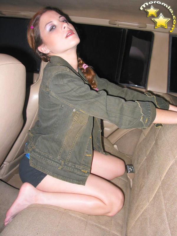 Moramia with pony tails & jeans hot pants undressing in her car