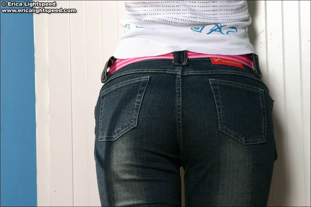 NN picture gallery of Erica stripping in blue room, showing her pink bra & sexy jeans